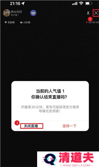 3、点击右上角关闭按钮,再在弹出来的弹窗中点击”关闭直播“按钮,直播结束。