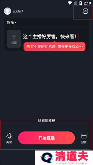 2、设置直播封面、标题、调整摄像头为前置摄像头,一般默认状态为前置摄像头、调整美颜效果。直播封面和标题完毕后,点击“开始直播“即可。