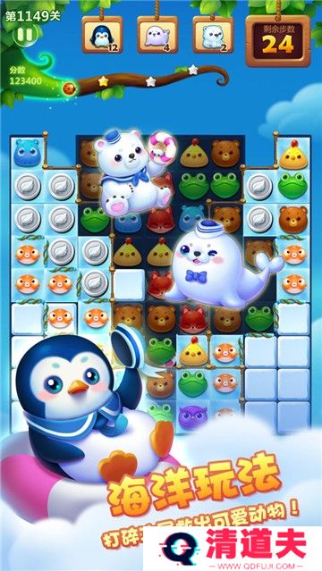 滑动手指让三个及以上的同色小动物横竖相连即可消除,完成每关的指定消除目标即可过关。