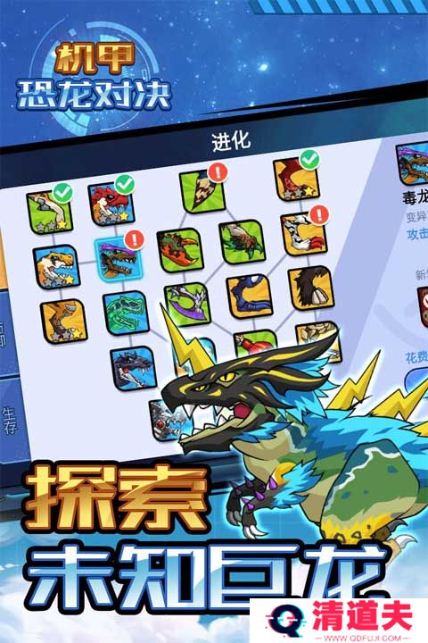 2、进化系统:通过收集DNA碎片,玩家可以进行恐龙的进化。每次进化都会增强机甲恐龙的能力,帮助在关卡中更顺利闯关。