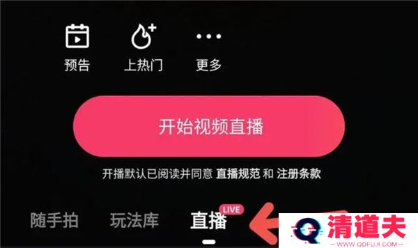 进入之后就会看到一共有三个选项,分别为随手拍,玩法库和直播,我们切换到直播界面。