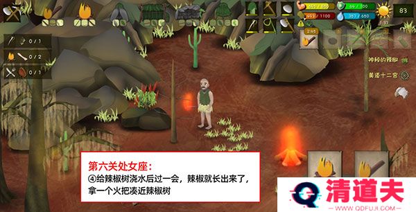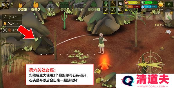 3、然后生火使用2个鞭炮即可石头砸开,石头砸开以后会出来一颗辣椒树。