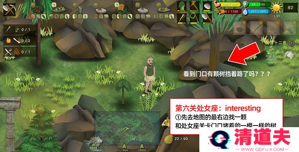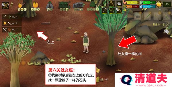 1、先去地图的最右边找一颗和处女座关卡门口堵着的一模一样的树。