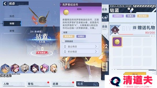赠送拟态角色礼物时,注意挑选她/他喜好的礼物赠送。例如钴蓝喜欢的是“金属制品”、“收藏品”、“限定商品”,我们送她对应类型的“克罗恩纪念币”能大幅提升唤醒值。反之,赠送的礼物不是拟态角色喜欢的类型,唤醒度只会少量提升。