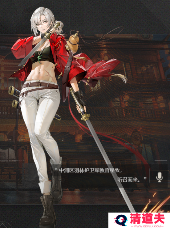 “羽林护卫军”中手持唐刀、英姿飒爽的女教官。她的战斗风格向来干脆利落、简单粗暴,就像她的性格一样直爽明快。工作之外,星牧也对养生颇有研究,腰上常备一壶温热养生茶,还会推拿按摩。