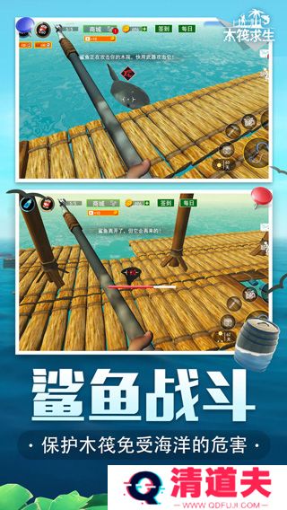 6、鲨鱼会攻击木筏,咬坏部分木筏时,玩家可以用木板修复。
