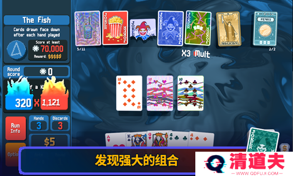 3、牌局随机性与策略性:每一次抽牌和弃牌的决策都可能影响游戏进程,结合小丑牌的变幻无常,游戏充满了不可预测性,提供了丰富的策略选择空间。