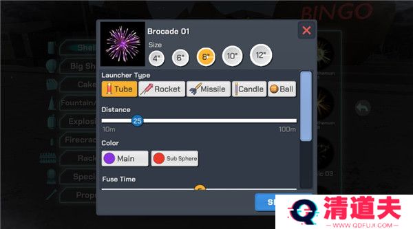 8、我们选择一个并点击,就会弹出这样一个界面,在这里可以选择烟花的大小、发射器的类型、烟花发射的距离、烟花引线燃烧的时间等等。