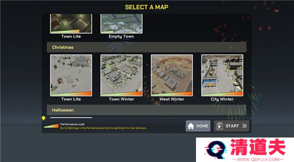 3、进入模式后,这里我们可以上下滑动,选择不同的地图去放烟花,选择好后点击start即可进入。