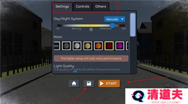 4、进入后会弹出一个设置,我们可以在此设置月亮颜色、地图日间夜间的时间、控制的灵敏度、还有烟花发射保障产生的振动等等,当我们设置好后,还可以点击下面的存储按键,保存下来,这样后面就不同再次手动调整了。