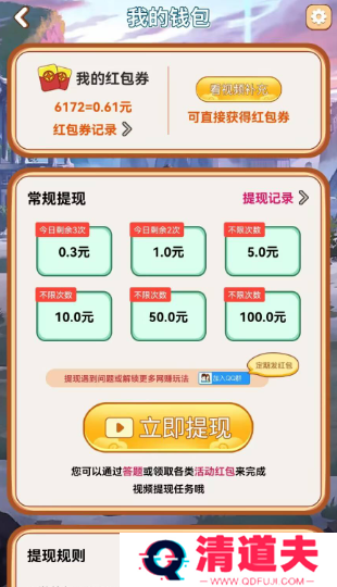 4. 兑换红包:玩家可以在游戏内将积分兑换成红包,红包金额取决于积分的多少。红包可以直接提现到玩家的账户中。