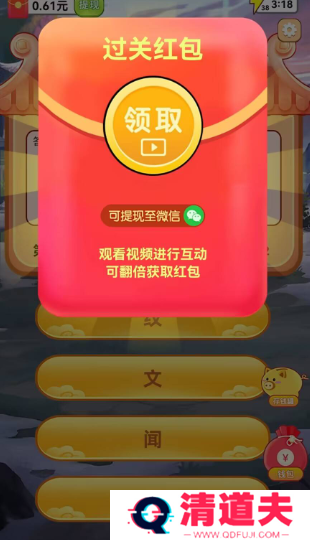 4. 答题闯关:在关卡中,玩家需要在规定的时间内回答一系列的问题。答对题目可以获得积分,积分可以用来兑换红包奖励。