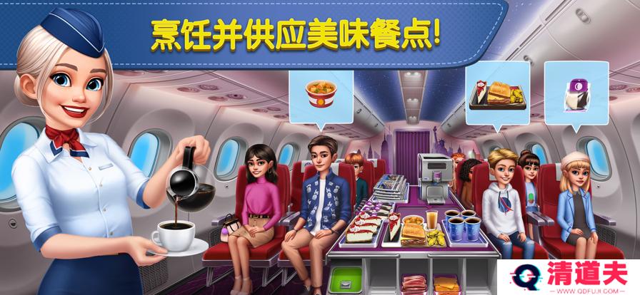 2. 精美的画面设计:游戏采用了美式卡通风格进行设计,整体画面精致细腻,无论是飞机餐厅的场景布置还是美食的造型设计,都展现得淋漓尽致。
