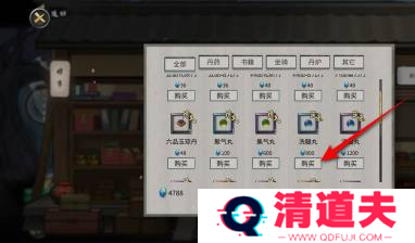 2、在坊市的购物界面中,搜寻洗髓丹并执行购买操作。