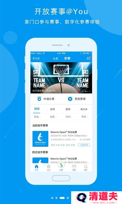 【开放赛事@You】在线报名,在家门口就能参加体育赛事;数字化参赛体验,全方位记录运动生涯;跟进赛事的深度报道,给你一球成名的机会;统筹全局的积分体系,还有丰厚奖品等着你!覆盖全国各个城市的易赛赛事,便是为你量身打造的全开放综合体育舞台。(后期赛事不断拓展可改为“易赛赛事”)