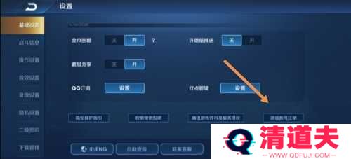 2、进入设置页面,点击右下方的游戏账号注销。