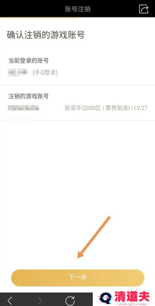 5、确认注销的游戏账号,点击下一步。