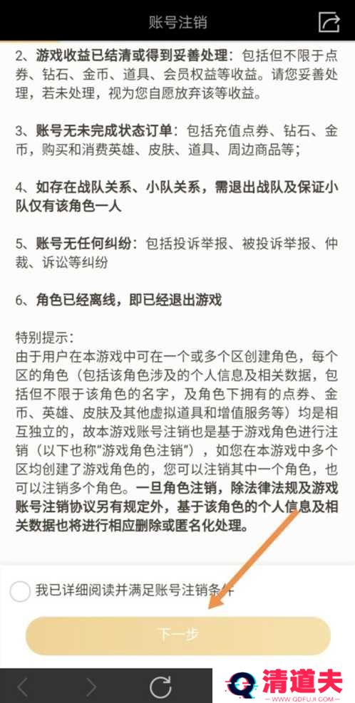 4、阅读并满足账号注销条件,点击下一步。