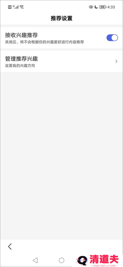 5、这里是推荐设置界面,这里可以对兴趣推荐、管理兴趣进行操作;