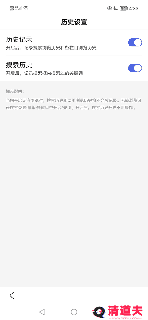 4、这里是历史设置界面,这里可以对历史记录和搜索历史进行操作;