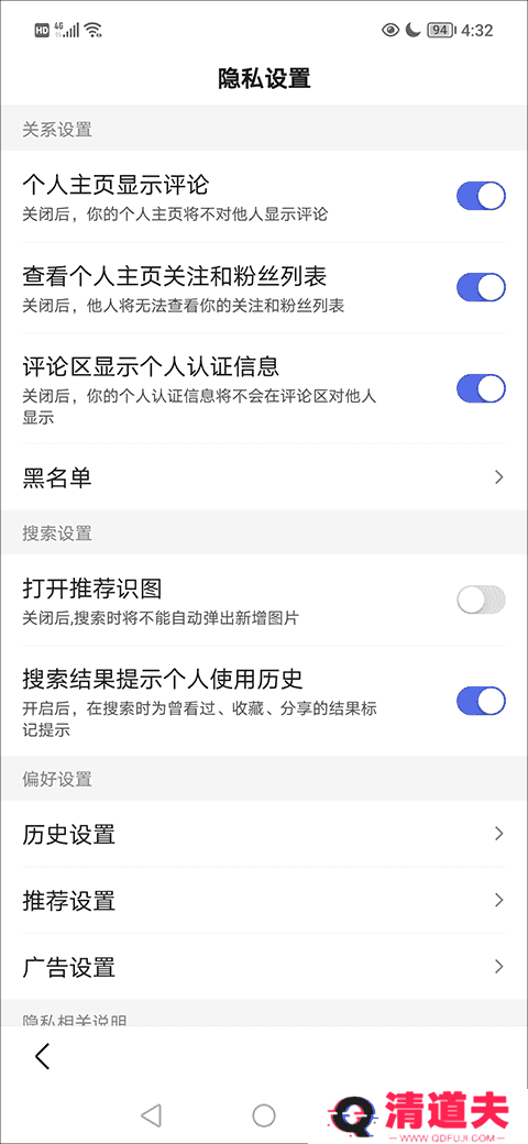 3、这里就可以对个人主页、关注和粉丝列表、显示认证信息、黑名单、打开推荐识图、搜索结果显示个人历史、历史设置、推荐设置、广告设置进行设置了;