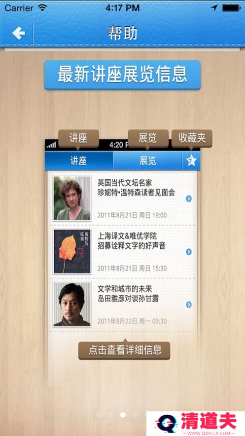 可以查询上海市中心图书馆以及各基层服务点的电话、地址、地图位置,并通过wifi、GPS定位服务搜索附近一定范围内的分馆信息