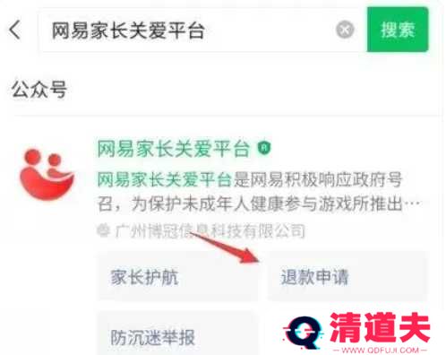1、打开微信,搜索“网易家长关爱平台”公众号并关注,在公众号中找到并点击“退款申请”选项。