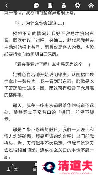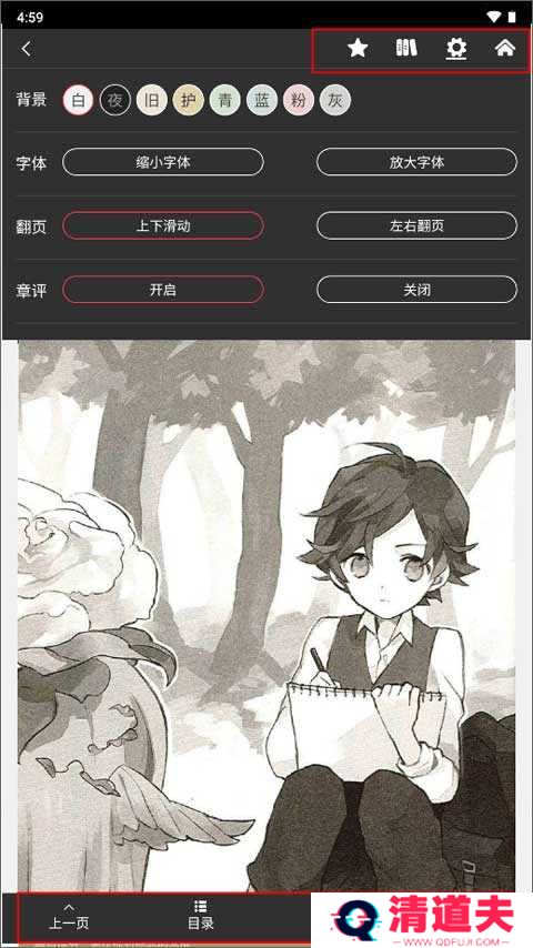 3、进入到阅读界面之后,再次点击屏幕,会弹出很多的选项,下方用来控制页面的翻页,上方则提供收藏、书架、设置以及首页按钮。如果对界面不喜欢,还可以修改背景、调整字体大小等。