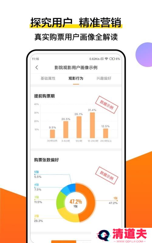 6、影院实时票房/用户画像数据:实时影院票房查询,确定竞对影院,制定经营决策; 借助阿里大数据洞悉影院周边和购票人群,更了解影院潜在观众;