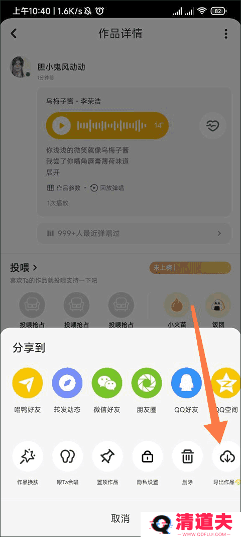 在底部弹出来了一个列表,列表内我们可以对作品进行分享或者调整,这个时候我们点击导出作品就可以了。