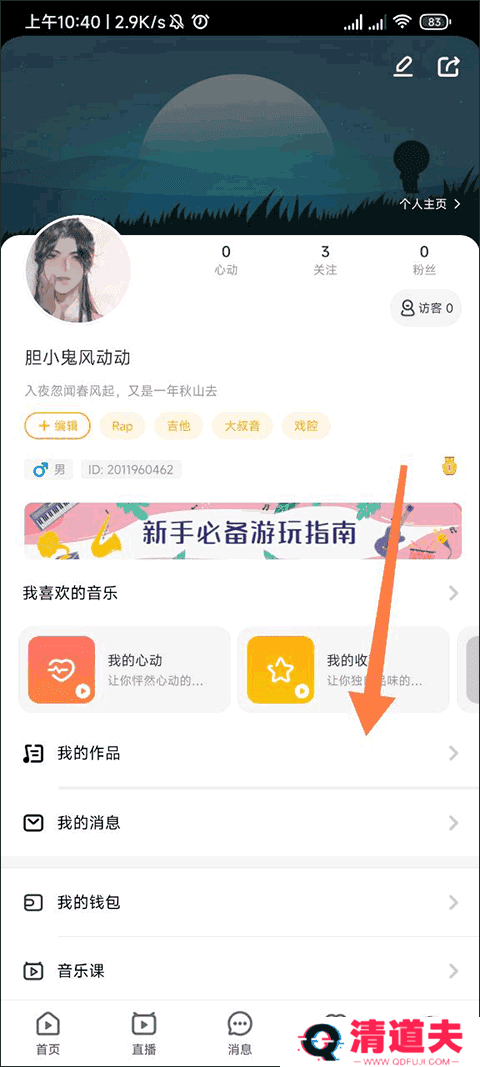 进入到个人界面后,大家可以查看自己关注的用户还有关注了我们的用户,还有一些自己收藏了的音乐作品,我们点击列表上的【我的作品】就可以查看我们自己发布的音乐作品了。