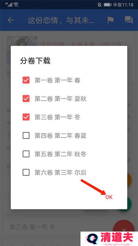 5、进入分卷下载界面,勾选需要下载的内容后,选择右下角【OK】选项就可以下载小说了。