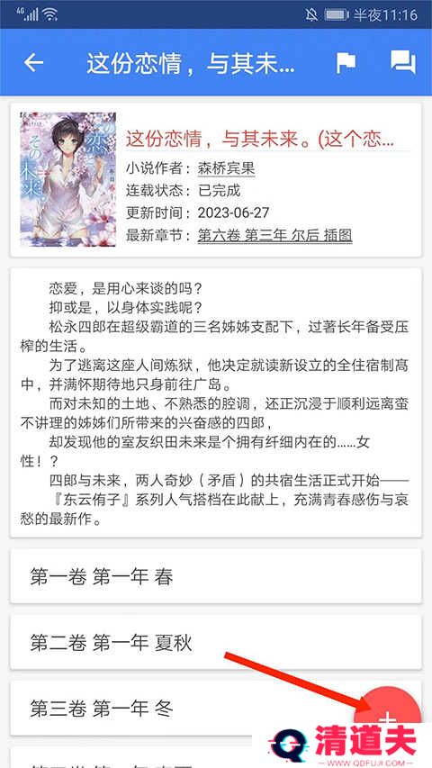 2、进入小说简介界面,选择右下角红色【+号】图标;