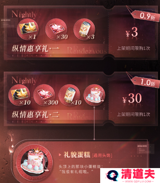 2、购买立得深空许愿券·限时*10、钻石*300、黑电能量·重磅*10、通用头饰礼貌蛋糕。