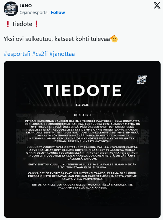 AHJO更名而来的JANO因签下allu与Twista领衔的阵容进入公众视野。这支不断变阵的队伍主要活跃于芬兰本土及国际次级赛事,期间allu担任狙击手。其高光时刻包括斩获Elisa系列赛多个本土冠军,以及获得2024年底Elisa 埃斯波大师赛参赛资格。