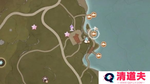 1、缎带鱼兑换:下图有六个粉色缎带鱼钓鱼点位,钓到粉色缎带鱼后,来到下图位置和npc进行对话,使用粉色缎带鱼兑换奖励。