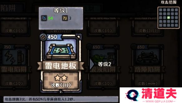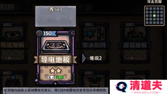 5、导电地板:该陷阱会对敌人造成AOE的雷电范围伤害,清杂能力比较强。