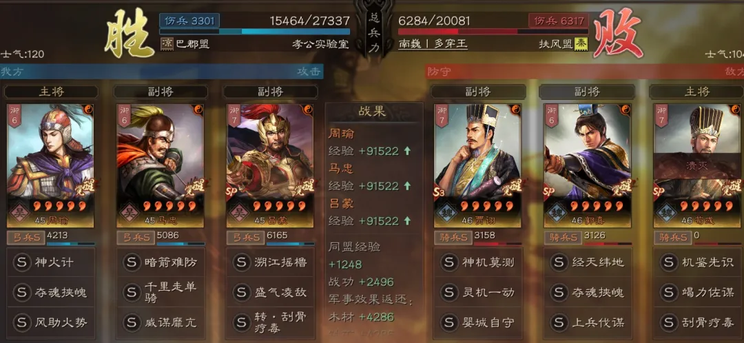 马忠哪怕进入战场后只有310左右武力(千里后再加50),在260%的基础伤害率保证下,也能打出这样的伤害。场均2发+普攻(不算威谋)通常都会有6000左右伤害,如果带的不是威谋,而是输出战法,本队可以说是一个双C阵容。