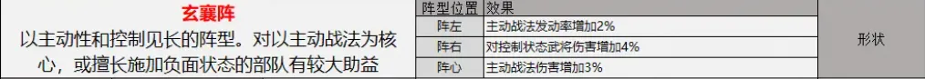 玄襄阵能很好的适配以主动战法为主要输出的队伍,也能强化队伍负面效果带来的收益。如五谋骑,周瑜弓等都能得到很好的加成。玄襄阵的增益,让马忠也有了在战场上一展风采的机会。