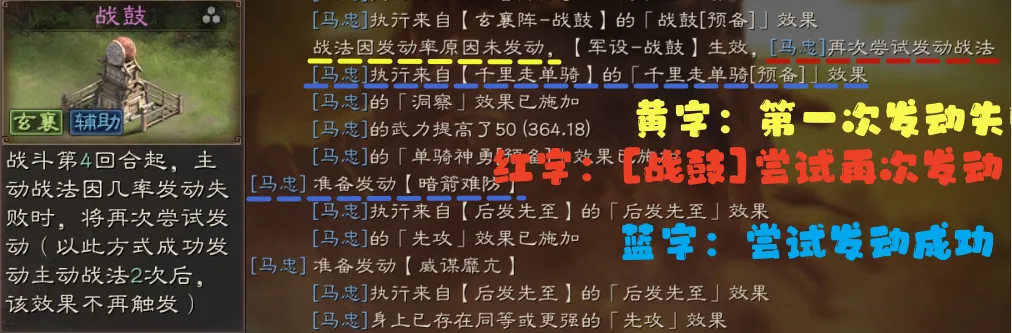 马忠能上战场不是因为他突然强大,而是因为玄襄阵的阵旗【战鼓】。通过给予额外一次的发动机会,极大提升了马忠和吕蒙的稳定性。