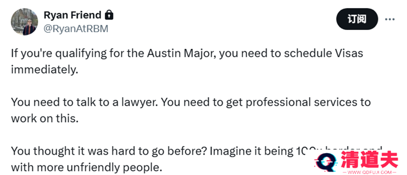 记者RyanAtRBM在社交平台上建议各战队立即寻求专业人士协助办理签证申请。