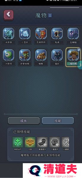 3、魔物携带:携带的是一只2级树妖,其技能为持续治疗和无敌。魔宠的品种和等级不是关键,最重要的是技能。理想情况下,携带一个无敌和一个治疗技能(快速治疗或持续治疗)就足够了。过多的技能会延长每个技能的释放时间,因此不必过分追求技能数量。如果2级魔宠就具备这两个技能,直接使用它们,其实比其他5、6级的魔宠更为实用。