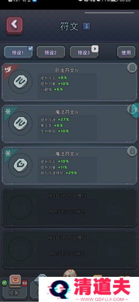 4、符文配置:使用的是巨龙4和魔法45符文。主要考虑的是提升攻击力、力量、生命偷取以及攻速的增减等属性。在参考了其他高级玩家的搭配后,选择了双攻速减慢和双吸血等组合。由于心疼符文石,没有尝试其他搭配,但至少会带一个魔法4的吸血符文。