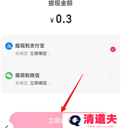 4、选择绑定微信或支付宝账号,并点击下方的【立即绑定】进行操作,最后点击【立即提现】按钮即可。