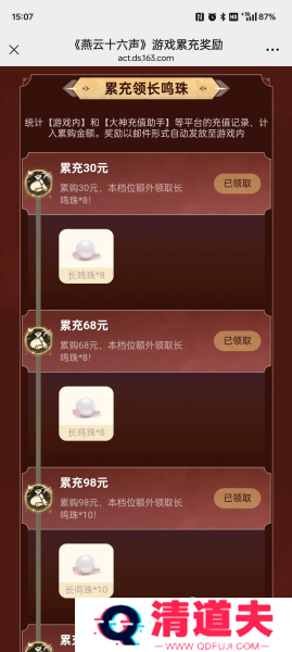 3、进入游戏累充奖励界面后,玩家就可以根据充值情况领取对应的奖励了。