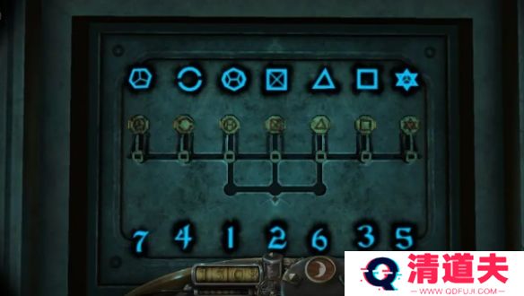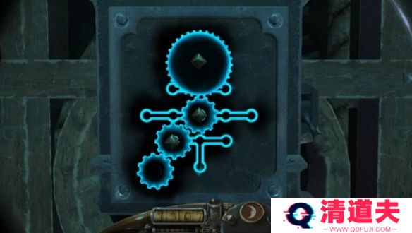 6、打开永恒之眼,拖拽调好齿轮位置,拉动右侧的拉杆,前往二楼,根据右侧木柜的锁孔调好钥匙,再拉动两侧的把手,楼梯降下。