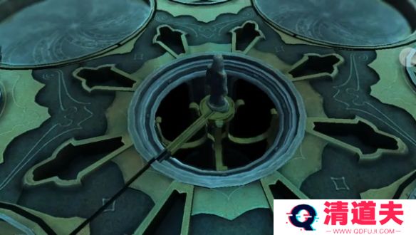 9、取下透镜,再将镂环转轮放置在屋顶,在机关中央的塔上点击铜锈插件,将铜锈插件插入小木屋旁的插孔中。