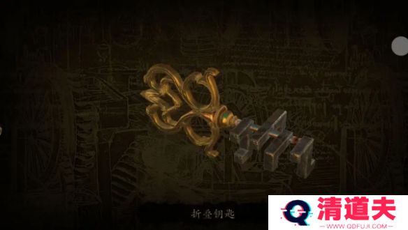 8、在小木屋后发现机关,旋转塔顶,点击得到黄铜折架,查看黄铜折架,旋转支架,得到镂环转轮。