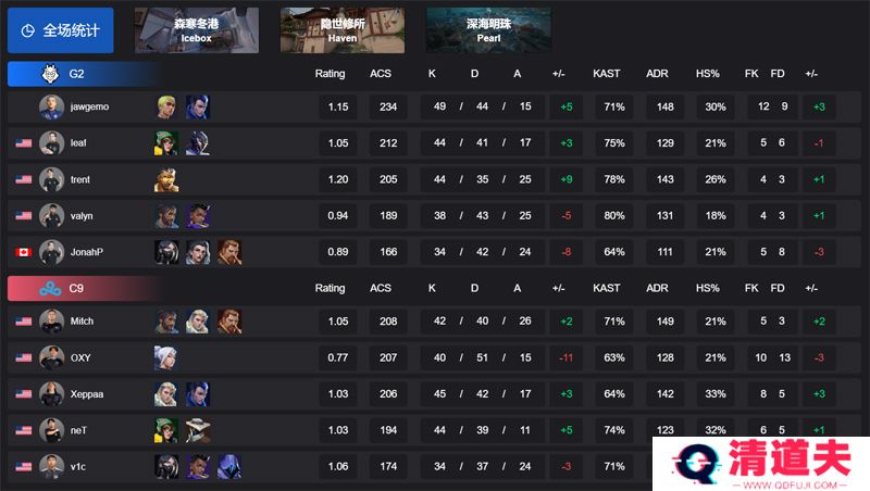 双方势均力敌,全场七人砍下40+击杀数,最终鏖战三图,在最后一图深海明珠,tren拿下1.49 rating,带领G2以13比11惊险击败C9,最终拿下5胜锁定小组第一。