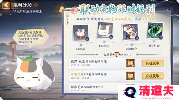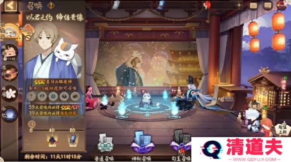 ※活动期间,大人使用神秘的符咒、勾玉、现世符咒进行召唤时,有一-定概率获得1枚「夏目&猫老师印花」。集齐对应5枚角色印花即可召唤对应角色。